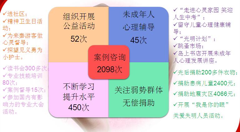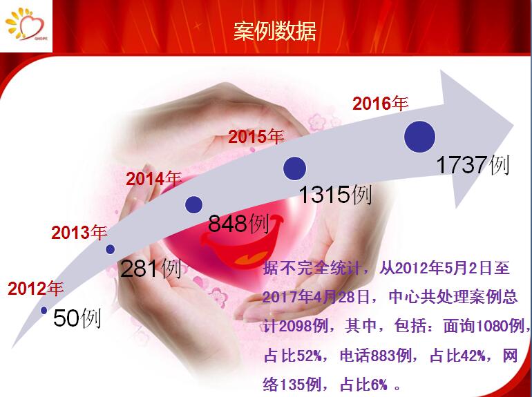 從上圖數(shù)據(jù)可以直觀的看出 自2014年開始,中心接受案例數(shù)據(jù)呈現(xiàn)大幅度增長,這要感謝秦皇島市海港區(qū)文明辦的大力支持;感謝各界媒體的關注和宣傳。