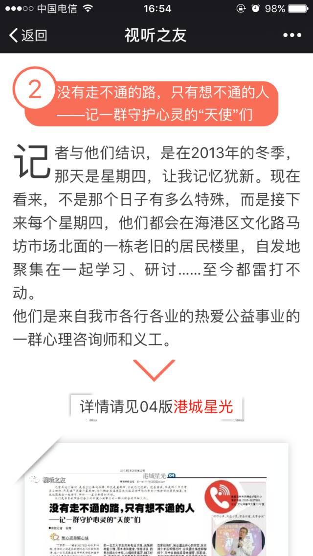 2017年5月26日,第22期《視聽之友》第四版“港城星光”欄目記者白梅的一篇《沒有走不通的路,只有想不通的人》,再次報道了秦皇島市市民情感護(hù)理中心的事跡和由來。