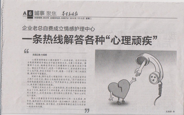 摘自《秦皇島晚報(bào)》(2014年10月15日,B15版):情感護(hù)理是一項(xiàng)新型的心靈慈善事業(yè),其以心理咨詢(xún)方式切入,但又不僅僅限于心理咨詢(xún),更側(cè)重于人生觀、價(jià)值觀、幸福觀的引導(dǎo)。秦皇島市市民情感護(hù)理中心的創(chuàng)始人名叫劉吉川,今年51歲,秦皇島華電測(cè)控設(shè)備有限公司總經(jīng)理。