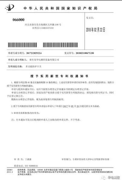 【企業(yè)要聞】公司申請的“多功能防護(hù)開關(guān)”專利授權(quán)