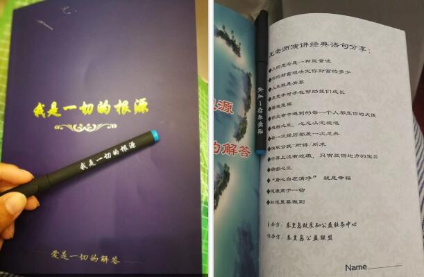 學(xué)習(xí)中,每個(gè)人手握著筆,告訴你“我是一切的根源”;手里拿著的筆記本,告訴你“我是一切的根源”;耳朵聽(tīng)到的是“我是一切的根源”;眼睛看到的是“我是一切的根源”。讓整個(gè)人從觸摸到看到聽(tīng),身心合一地去感悟“我是一切的根源”。