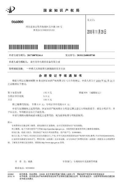 公司于2017年2月14日提交的“一種槽式太陽(yáng)能聚光器鏡面的設(shè)計(jì)方法”(專利號(hào):201710078246.4)專利已被中華人民共和國(guó)國(guó)家知識(shí)產(chǎn)權(quán)局授予發(fā)明專利權(quán)。此項(xiàng)專利的授權(quán),標(biāo)志著公司已經(jīng)擁有43項(xiàng)自主知識(shí)產(chǎn)權(quán)。