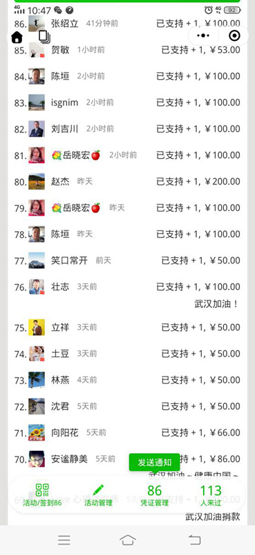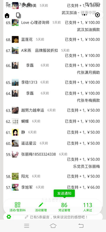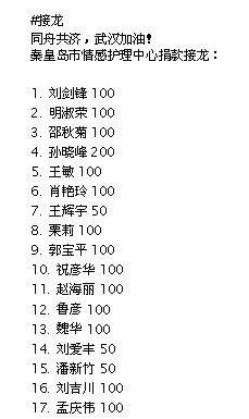 倡議發(fā)出后,得到了大家的積極響應(yīng),集團員工、員工家屬、情感中心心理咨詢師、志愿者以及社會人士紛紛捐款,短短幾天共參與125人次,其中華控集團黨支部、工會委員會募捐到6800元,情感中心募捐到3700元,共計募捐到了10500元。經(jīng)過大家的民主決議,我們將募集到的款項捐贈到秦皇島市應(yīng)對新型冠狀病毒感染的肺炎疫情工作領(lǐng)導(dǎo)小組辦公室提供的市衛(wèi)健委的賬戶上。