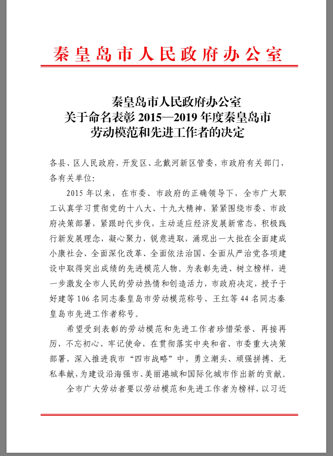 秦皇島市人民政府辦公室于2020年 1月3日向我公司下發(fā)《關(guān)于命名表彰2015-2019年度秦皇島市勞動模范和先進(jìn)工作者的決定》,公司總工程師于勝利被評為秦皇島市勞動模范。