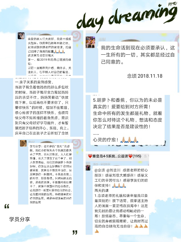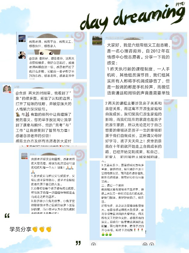 課程結(jié)束后看到大家都在群里分享自己的感想與收獲,讓我想起開(kāi)課前臨時(shí)邀請(qǐng)擔(dān)任主持人,當(dāng)時(shí)的心情特別矛盾。有興奮,第一次上臺(tái)當(dāng)主持對(duì)自己是個(gè)很大的挑戰(zhàn);有心虛,非常不自信覺(jué)得自己做不好;有糾結(jié),因?yàn)楹⒆舆€有兩天時(shí)間就期末考試。最后我還是決定抓住機(jī)會(huì),做自己想做的,相信越努力越幸運(yùn),于是我就這樣在沒(méi)有任何準(zhǔn)備的情況下做了兩天的主持人。