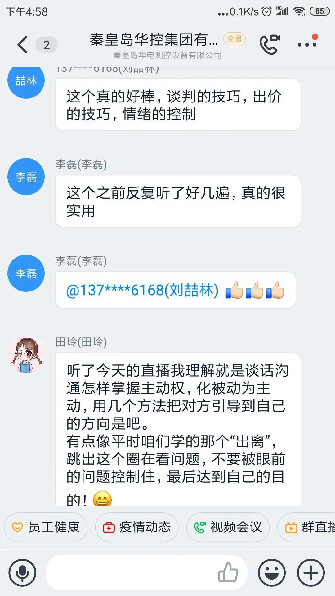 線上充電,勤修內(nèi)功,防疫不忘學(xué)習(xí)。線上培訓(xùn)課程豐富,體驗感強(qiáng),有收獲,有提升,線上沒聽懂的還可以觀看“直播回放”反復(fù)學(xué)習(xí),溫故而知新,成效明顯。在人力資源部的引領(lǐng)下,大家線上積極交流培訓(xùn)感悟。