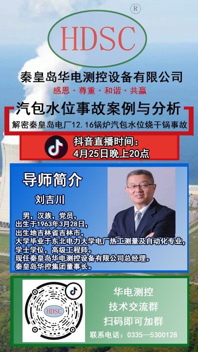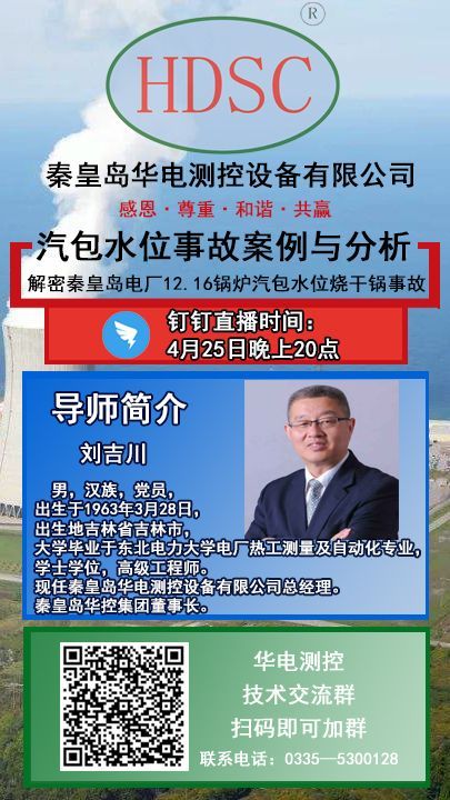 2020年4月25日晚8時(shí),秦皇島華控集團(tuán)有限公司董事長(zhǎng)劉吉川先生攜手【熱控圈】舉辦“火力發(fā)電廠鍋爐汽包水位測(cè)量系統(tǒng)系列講座之解密秦皇島電廠12.16鍋爐汽包燒干鍋事故”?!扒Я摹薄ⅰ岸兑簟?、“釘釘”軟件同步直播。