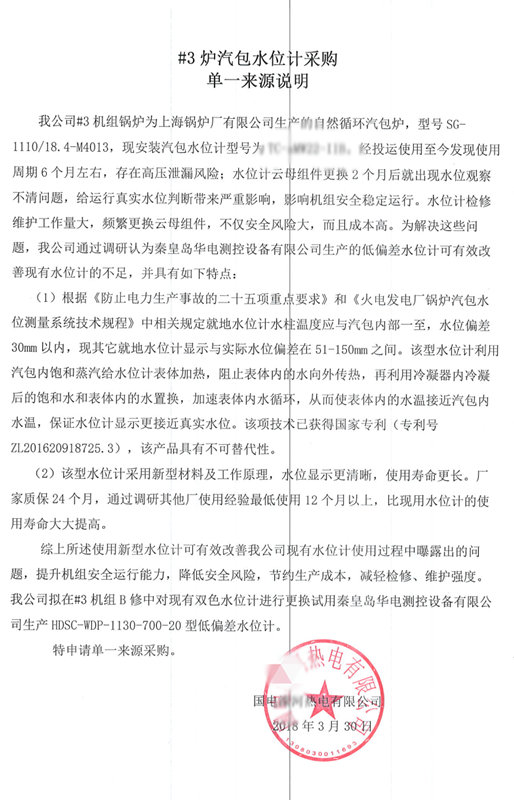 該電廠擁有3臺300MW火力發(fā)電機組,2005年投產(chǎn)運行。由于汽包水位測量系統(tǒng)測量偏差較大,存在了嚴(yán)重的安全隱患。在2018年采用了我公司的專利產(chǎn)品高精度云母水位計后,解決了原有水位測量不準(zhǔn)確的問題,為日后的安全運行工作帶來了保障。