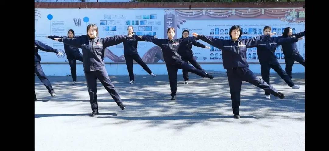原來,是我們的美女員工們正在操練??矗碇P挺工裝的她們還在為職工廣播體操展演做最后的準(zhǔn)備。