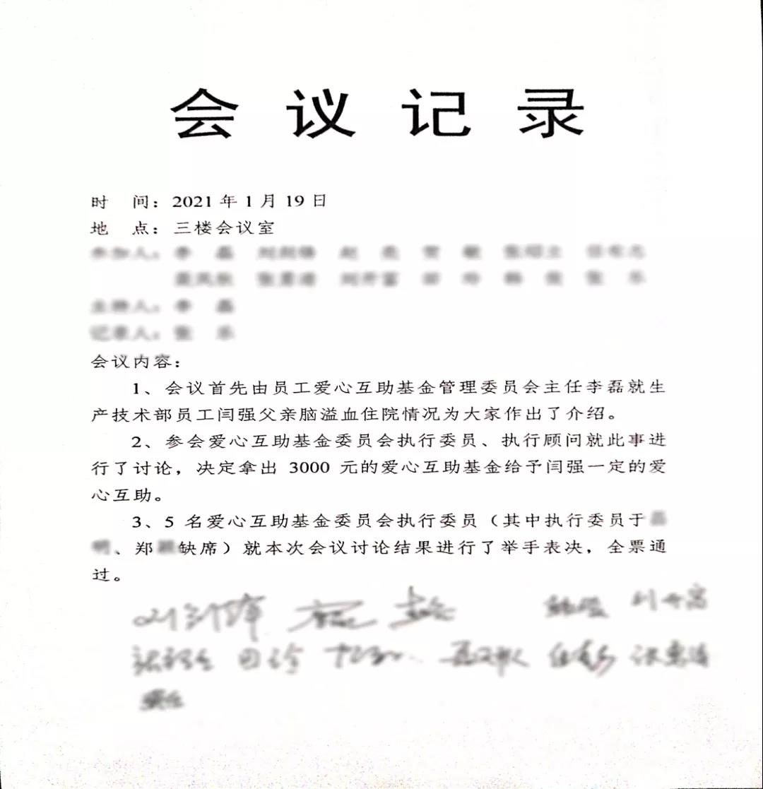1月19日,當(dāng)公司領(lǐng)導(dǎo)得知生產(chǎn)技術(shù)部員工閆強父親因腦溢血而住院的情況后,組織召開了員工愛心互助基金會議,會上經(jīng)過集體討論,基金決定拿出3000元款項給予一定的愛心互助。