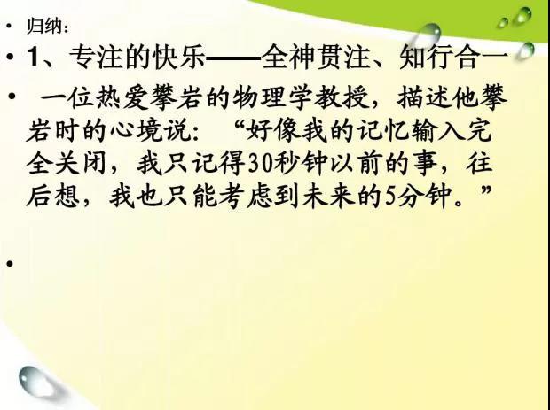 心流不是雞湯,而是讓你保持專注高效、幸福感翻倍的科學(xué),是一個人完全沉浸在某種活動當(dāng)中,無視其他事物存在的狀態(tài)。比如:運動、音樂、看書、美食、約會、工作等等很多事情可以讓我們進入心流狀態(tài),這些都可以讓我們感到幸福。