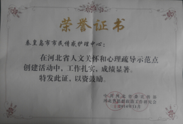 2014年11月,秦皇島市市民情感護(hù)理中心在河北省人文關(guān)懷和心理疏導(dǎo)示范點(diǎn)創(chuàng)建活動(dòng)中,工作扎實(shí),成績(jī)顯著,喜獲中共河北省委宣傳部、河北省思想政治工作研究會(huì)頒發(fā)的榮譽(yù)證書。