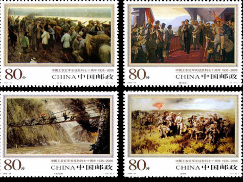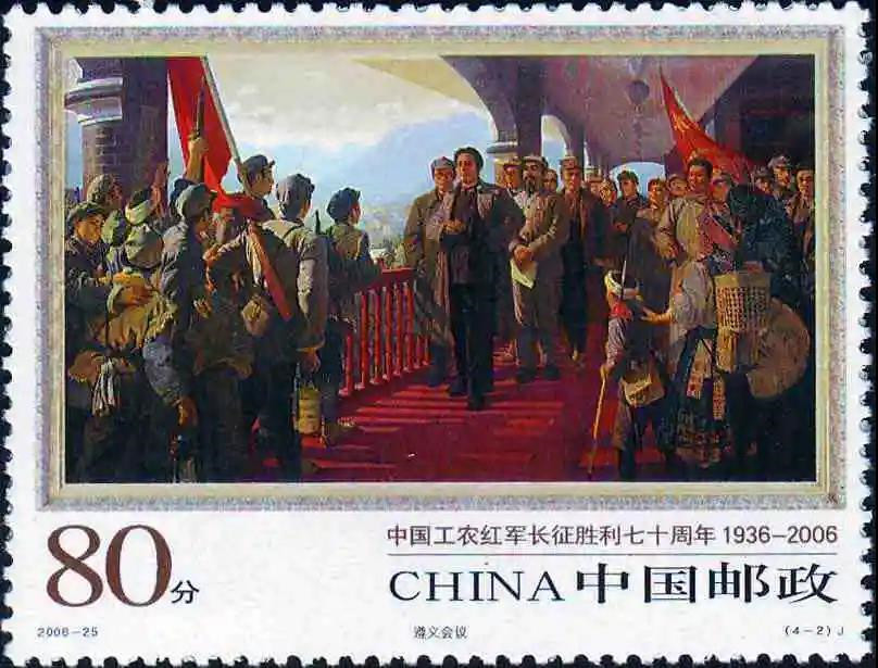 遵義會(huì)議作為紅軍長征途中的重要會(huì)議,也曾出現(xiàn)在2006年10月22日發(fā)行的《中國工農(nóng)紅軍長征勝利七十周年》的紀(jì)念郵票1套4枚中。志號(hào):2006-25,設(shè)計(jì)者:郝旭東。畫作者:靳尚誼(4-1)、彭 彬(4-2)、劉國樞(4-3)、張文源(4-4)、李寶林周順愷(小型張)。
