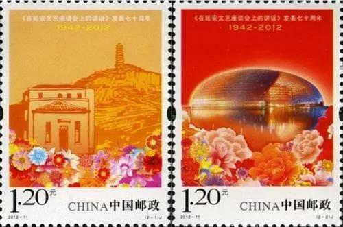 中國郵政于2012年5月23日發(fā)行《<在延安文藝座談會上的講話>發(fā)表七十周年》紀(jì)念郵票1套2枚。票圖名稱分別為“座談會舊址”、“文藝發(fā)展繁榮”,郵票面值均為1.20元。設(shè)計(jì)者為郭線廬。郵票發(fā)行同時(shí)推出郵票首日封。
