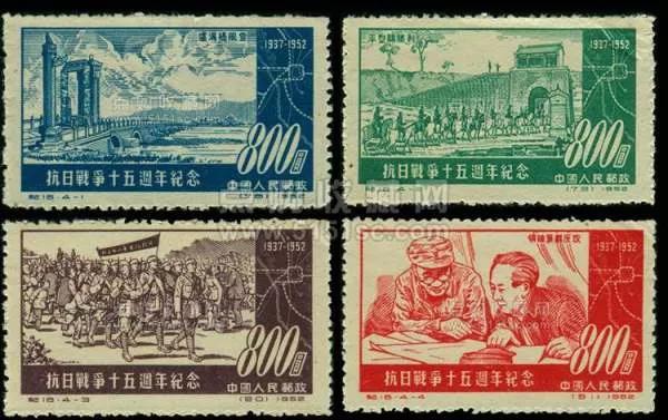 第一枚,盧溝橋風云。1952年7月7日發(fā)行了首枚《抗日戰(zhàn)爭十五周年紀念》郵票,這是新中國第一枚反映抗戰(zhàn)的郵票。這枚膠版郵票長37毫米,寬21毫米,面值為人民幣舊幣800元。孫傳哲設(shè)計,主圖為盧溝橋全景,盧溝橋的上空風起云涌,象征著日寇全面侵華戰(zhàn)爭的來臨,橋身兩側(cè)護欄望柱的小石獅來整有序地并行排列,好像守衛(wèi)山河的忠誠戰(zhàn)士,橋身下靜靜流淌的永定河水,寓意著中國人民面對災(zāi)難時的從容鎮(zhèn)定,遠處連綿起伏巍然屹立的太行群峰,宛如全民族筑起抗戰(zhàn)的鋼鐵長城。