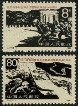 第三枚,七七戰(zhàn)火。1995年9月3日發(fā)行了《抗日戰(zhàn)爭及世界反法西斯戰(zhàn)爭勝利50周年》紀念郵票的首枚,這枚影寫版郵票長40毫米,寬30毫米,面值10分,何潔、陳楠、馮小紅聯(lián)合設(shè)計。郵票主圖以黑白照片資料取舍加工,以靜態(tài)為主,定格了中國守軍的盧溝橋頭嚴陣以待、抗擊日寇的歷史場面。