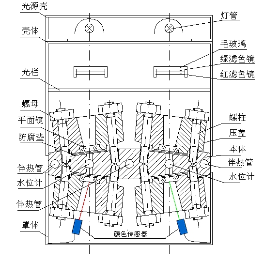 是否云母水位計(jì)可以像差壓水位計(jì)和電接點(diǎn)水位那樣在機(jī)組運(yùn)行時(shí)投入調(diào)節(jié)和保護(hù)呢。通過(guò)查詢一些資料發(fā)現(xiàn)顏色是可以被測(cè)量的,在這里簡(jiǎn)單說(shuō)明一下顏色的原理,顏色是眼睛和神經(jīng)系統(tǒng)對(duì)光源的感覺(jué),它是光源在眼睛的視網(wǎng)膜上形成的訊號(hào)刺激大腦皮層產(chǎn)生的反應(yīng),這種生理的反應(yīng)就是顏色的感覺(jué)。顏色的三要素是:光源、觀察物體和觀察者(器),在這里我們是可以在觀察器上著手加以研究的。紅、綠、 藍(lán)就是人們常常所說(shuō)三原色光,達(dá)到顏色匹配時(shí)所需要的三原色的數(shù)量,稱三刺激值。通過(guò)光在有水和無(wú)水的折射不同,云母水位計(jì)主要產(chǎn)生兩種光線:紅光和綠光,可見(jiàn)光是自然界中光譜的一小部分,由于波長(zhǎng)在0.77~0.39微米之間的光,可以被人的肉眼看見(jiàn),物理學(xué)上把之稱為可見(jiàn)光。可見(jiàn)光波長(zhǎng)為0.77~0.39微米之間,紅光與綠光均為可見(jiàn)光,紅色的波長(zhǎng)為0.622~0.597微米,綠光的波長(zhǎng)為0.492~0.455微米。