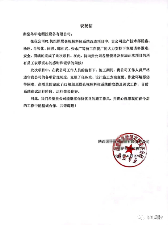 項目改造效果得到廠領(lǐng)導(dǎo)及工作人員認(rèn)可,現(xiàn)場工程技術(shù)人員更是得到電廠上下的一致好評。項目結(jié)束后電廠立刻發(fā)來《表揚信》,信中電廠對生技部楊鑫、楊旺、肖智化、閆強(qiáng)、邸相武、張勇廣等員工的專業(yè)技術(shù)和工作態(tài)度給予肯定,并向我公司及工作人員標(biāo)識感謝,最后“祝愿我們在今后的工作中能精誠合作,共鑄輝煌!”公司一直致力于解決火力發(fā)電廠煤倉“堵煤”、“棚煤”、“漏眼”、“板結(jié)”、煤倉狀態(tài)實時監(jiān)測、煤倉安全管理等問題。自主研發(fā)、生產(chǎn)的HDSC煤倉綜合管理系統(tǒng)系列產(chǎn)品在國際上處于領(lǐng)先水平,占據(jù)國內(nèi)主要市場,并遠(yuǎn)銷海外,用戶超過800家,受到廣泛贊譽(yù)。公司生產(chǎn)的煤倉自動疏松裝置先后榮獲河北省中小企業(yè)質(zhì)量信得過產(chǎn)品、名牌產(chǎn)品稱號,煤倉綜合控制系統(tǒng)被認(rèn)定為河北省軟件產(chǎn)品。