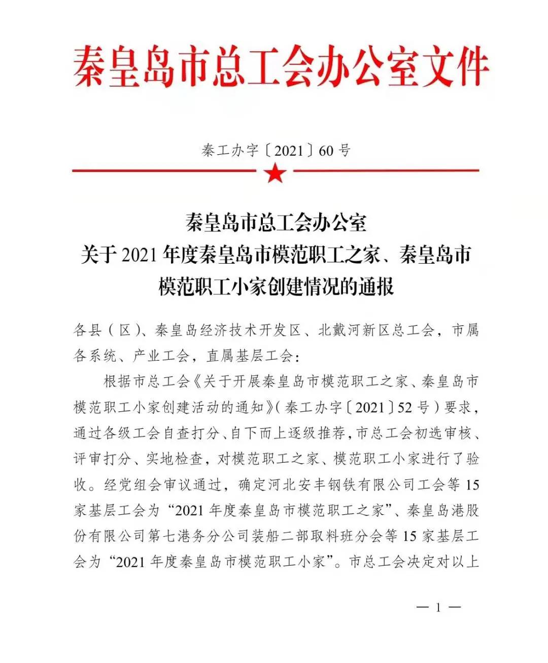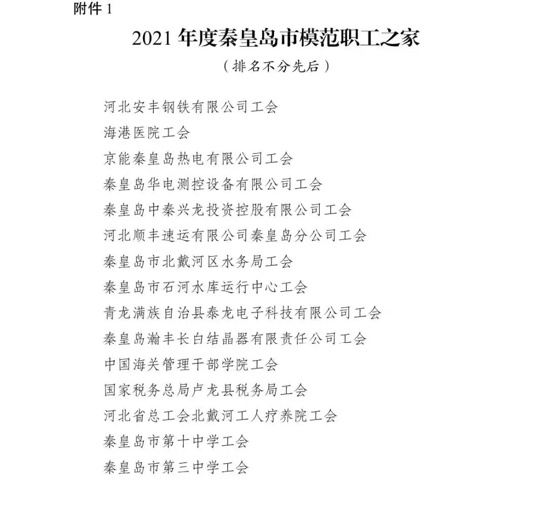 華電測控工會委員會被評為2021年度“秦皇島市模范職工之家”稱號