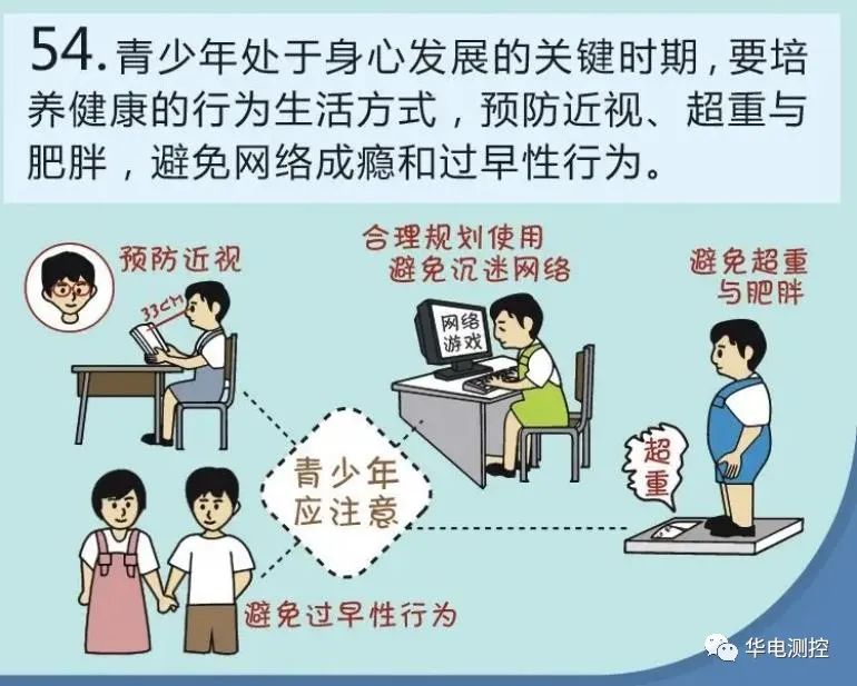 青少年是祖國(guó)的未來(lái),提高他們的健康素養(yǎng),是實(shí)現(xiàn)健康中國(guó)戰(zhàn)略目標(biāo)的關(guān)鍵。《中國(guó)公民健康素養(yǎng)—基本知識(shí)與技能》第二部分,關(guān)于“健康生活方式與行為”,其中第五十四條強(qiáng)調(diào):“青少年處于身心發(fā)展的關(guān)鍵時(shí)期,要培養(yǎng)健康的行為生活方式,預(yù)防近視、超重與肥胖,避免網(wǎng)絡(luò)成癮和過(guò)早性行為。”