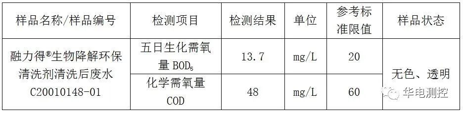融力得®生物降解環(huán)保清洗劑經(jīng)英格爾檢測技術(shù)服務(wù)(上海)有限公司檢驗,生化需氧量為13.7 mg/L,遠(yuǎn)遠(yuǎn)高于中國國家環(huán)保標(biāo)準(zhǔn)要求,可以通過工廠現(xiàn)有污水處理系統(tǒng)進(jìn)行排放。