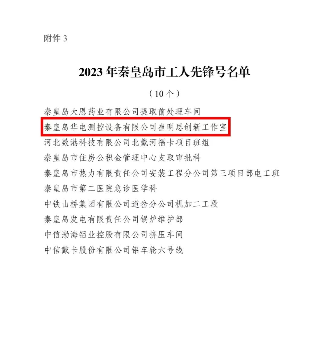 華電測控“崔明思創(chuàng)新工作室”被秦皇島市總工會授予2023年秦皇島市工人先鋒號