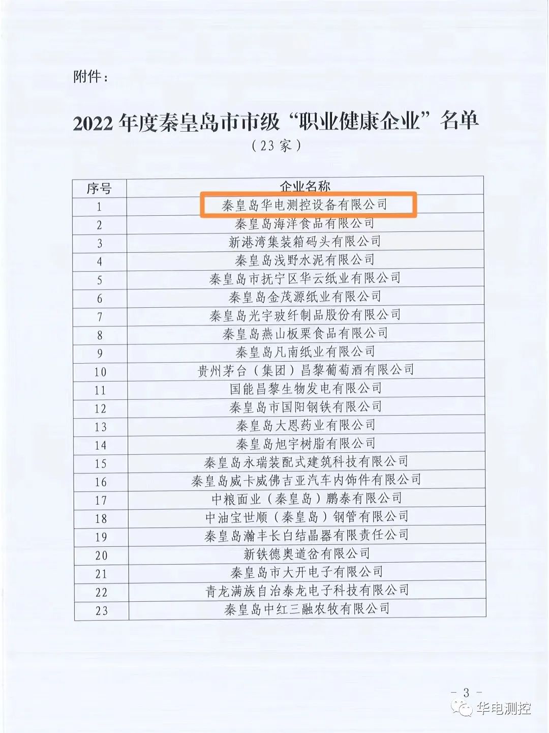 秦皇島華電測控設(shè)備有限公司獲評為2022年度秦皇島市職業(yè)健康企業(yè)