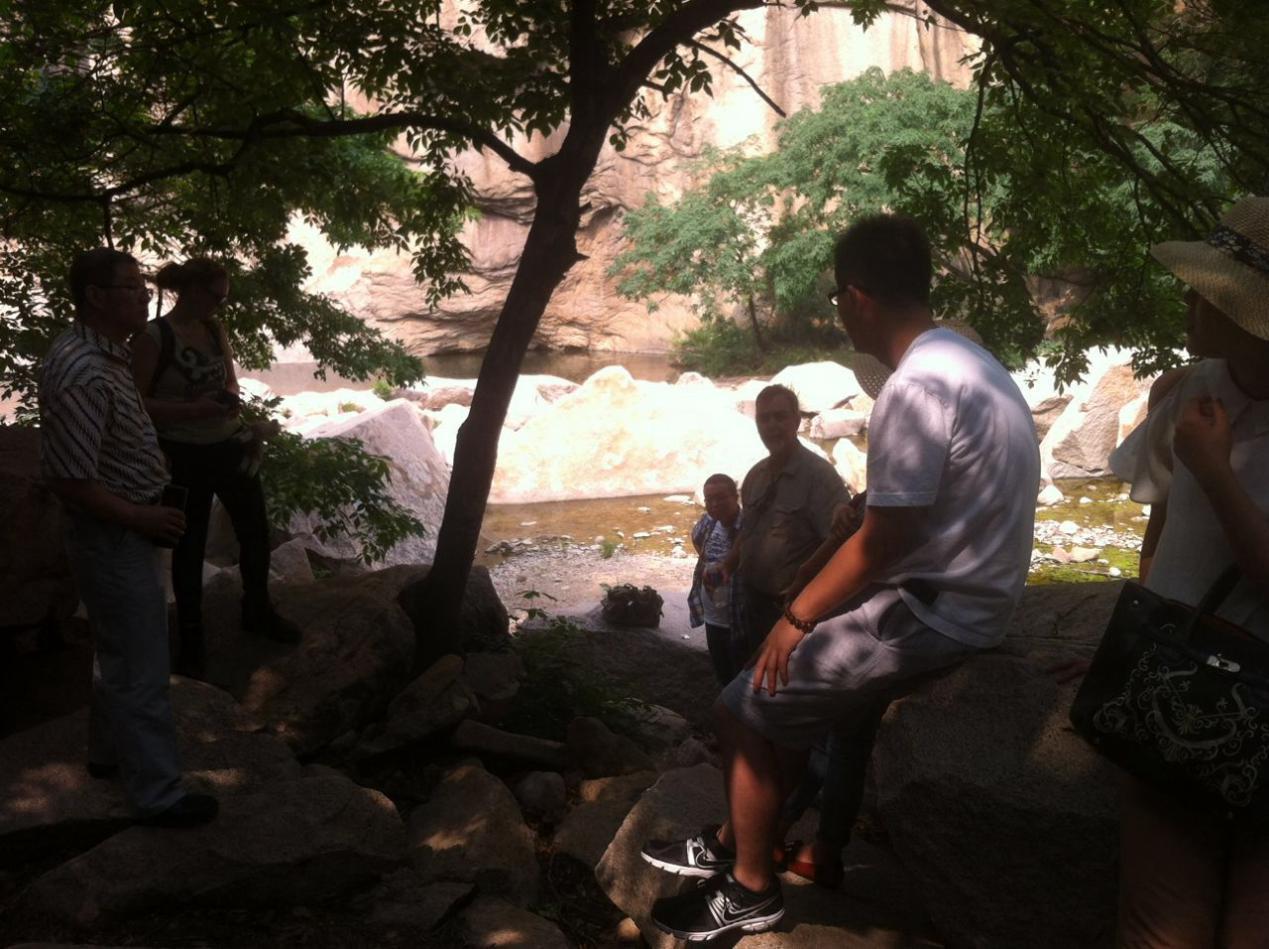 在公司總經(jīng)理劉吉川先生的引領(lǐng)下,邁克、安娜等一行八人攀登了長(zhǎng)壽山景區(qū)的九重天山峰,穿越一線天,駐足山巔,登高望遠(yuǎn),邁克和安娜無不為眼前這雄偉壯觀的風(fēng)景所驚嘆。隨后,又依次參觀了懸陽(yáng)洞、神醫(yī)石窟、壽字碑林等景區(qū),領(lǐng)略其中的歷史文化和人文精神。在山底的一堆巖石中,劉總帶領(lǐng)邁克和安娜見證了“生命的力量”,這是一棵從亂石崗中生長(zhǎng)出來的大樹,它為了生存,需要更大的力量去向下生根以獲取水源,向上攀爬以獲取陽(yáng)光,用自己的生命高度地詮釋了“夾縫中求生存”,這種生命的力量激勵(lì)著劉總用更大的勇氣和信心去建設(shè)華電測(cè)控。美國(guó)友人邁克感同身受,感慨道:“No pain, no gain.”(譯文:沒有痛苦,就沒有收獲)。安娜則對(duì)中醫(yī)文化情有獨(dú)鐘,劉吉川先生向她講解了刮骨療傷的故事,并借著李時(shí)珍、華佗等神醫(yī)石窟的雕像,概述了中國(guó)中醫(yī)文化的歷程。安娜不時(shí)地給雕像和碑文拍照,并把劉總的講解記錄在了她的日記本中,安娜說她回國(guó)后馬上就要開始讀醫(yī)學(xué)的研究生,劉總生動(dòng)的講解激發(fā)了她對(duì)醫(yī)學(xué),特別是中醫(yī)學(xué)的興趣,真是起到了拋磚引玉的作用。