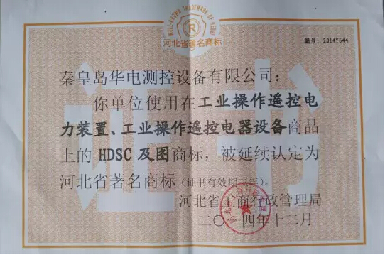 近日,公司收到河北省工商行政管理局頒發(fā)的“河北省著名商標(biāo)”證書。這是公司使用在工業(yè)操作遙控電力裝置、工業(yè)操作遙控電器設(shè)備商品上的HDSC及圖商標(biāo),繼2008年首次被認(rèn)定為“河北省著名商標(biāo)”后的連續(xù)認(rèn)定,證書編號(hào)為:2014Y644。