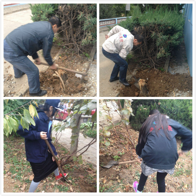 最后一組負(fù)責(zé)鏟除花壇中枯死的樹根,大家奮勇爭(zhēng)先、眾志成城,終于順利鏟除了花壇中的四個(gè)“根深蒂固”的老樹根。