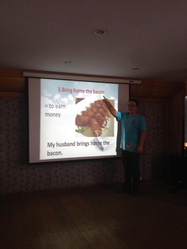 第一個(gè)環(huán)節(jié)大家學(xué)習(xí)了“與食物有關(guān)的俗語”。通過觀看大屏幕上吸引人的照片,他們學(xué)習(xí)了十個(gè)與食物有關(guān)的英語俗語。比如piece of cake(容易的事情), to go bananas(變瘋狂了), bring home the bacon(賺錢), have bigger fish to fry(有更重要的事情要做),like two peas in a pod(很相似), eat like a horse(很能吃), as red as a cherry(非常紅)……下一個(gè)環(huán)節(jié)是口語學(xué)習(xí)。這次他們學(xué)習(xí)了如何表達(dá)“感謝”和“對(duì)不起”以及如何回答別人的感謝和抱歉。在英語中我們有時(shí)可能會(huì)混淆回答“謝謝”和“對(duì)不起”的答語。在這個(gè)環(huán)節(jié)過后,大家對(duì)他們的區(qū)別有了更深的了解。最后他們做了一個(gè)簡(jiǎn)單的測(cè)驗(yàn),檢驗(yàn)一下他們是否在英語角有所收獲。