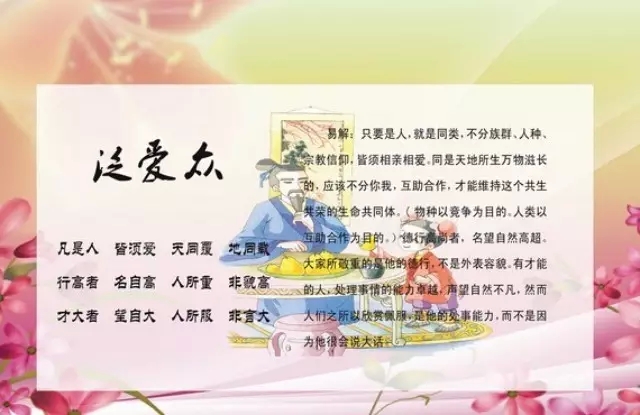 “凡是人,皆須愛,天同覆,地同載”。所有人都需要愛和被愛,天下萬物都是一樣的,這也就是我們經常說的大同世界。當我回家走進電梯時,看見一個陌生的小朋友,我們互相看了一眼并未說話,我想起了《弟子規(guī)》,就先和小朋友問了個好,接來下小朋友也向我問了好,我們之間的距離頓時就近了,表情也發(fā)生了變化,和睦的氣氛一出來,那種陌生感瞬間消失,美好的氛圍出來了,這就是大愛吧! ――劉劍鋒
