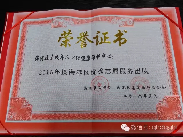 2016年5月26日上午,海港區(qū)區(qū)委區(qū)政府組織召開了海港區(qū)志愿服務工作推進會。會上對2015年度海港區(qū)優(yōu)秀志愿者及志愿者團隊進行了表彰,海港區(qū)未成年人心理健康維護中心暨秦皇島市市民情感護理中心喜獲2015年度海港區(qū)優(yōu)秀志愿者團隊獎。