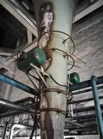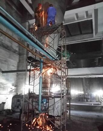為了不影響正常的運行,該廠采用了空氣炮、氣旋管、人工疏松等辦法進(jìn)行處理,但是收效甚微,直至今日空氣炮儼然成為了雞肋,為了保證安全運行鍋爐運行人員必須每班安排專人進(jìn)行維護,大量消耗了人力與物力。為解決煤倉堵煤、棚煤問題,該廠決定在十臺煤倉上安裝我公司煤倉疏松機,下圖為現(xiàn)場施工人員安裝我公司煤倉疏松裝置。