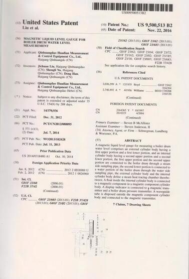 好消息:公司于2014年7月向美國提交的“汽包水位磁致液位計”發(fā)明專利申請,經(jīng)過Director of the United States Patent and Trademark Office嚴謹認真的審查,已經(jīng)于2016年11月22授予了發(fā)明專利權(quán),頒發(fā)了美國發(fā)明專利證書,專利號為:U.S.Patent No.9500513 B2。