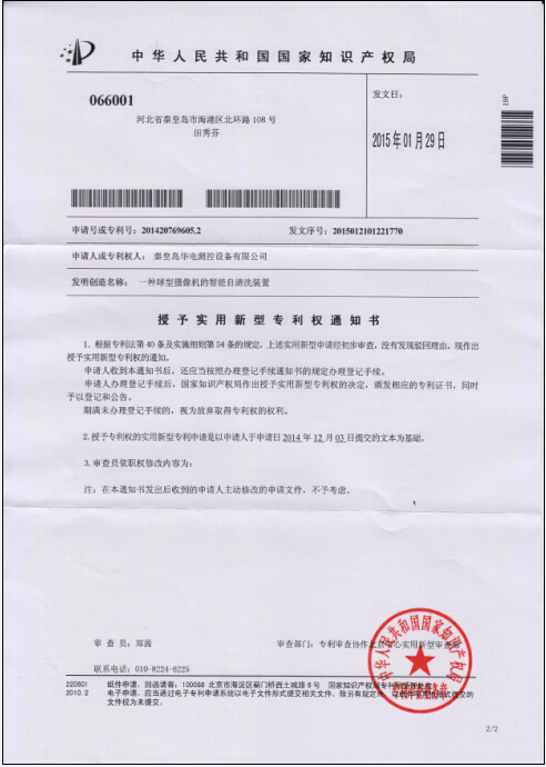 公司于2014年12月03日提交的“一種球型攝像機的智能自清洗裝置”專利已被中華人民共和國國家知識產(chǎn)權(quán)局授權(quán)實用新型專利權(quán)。